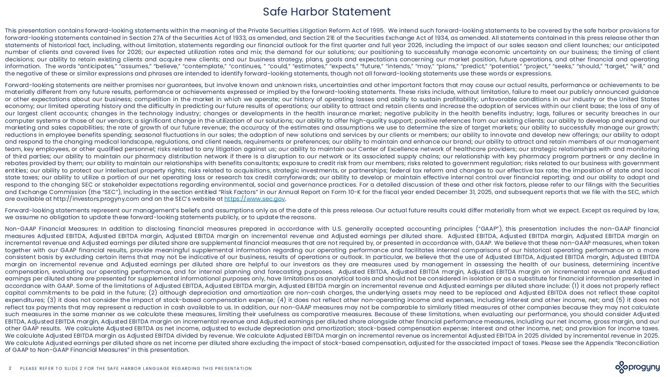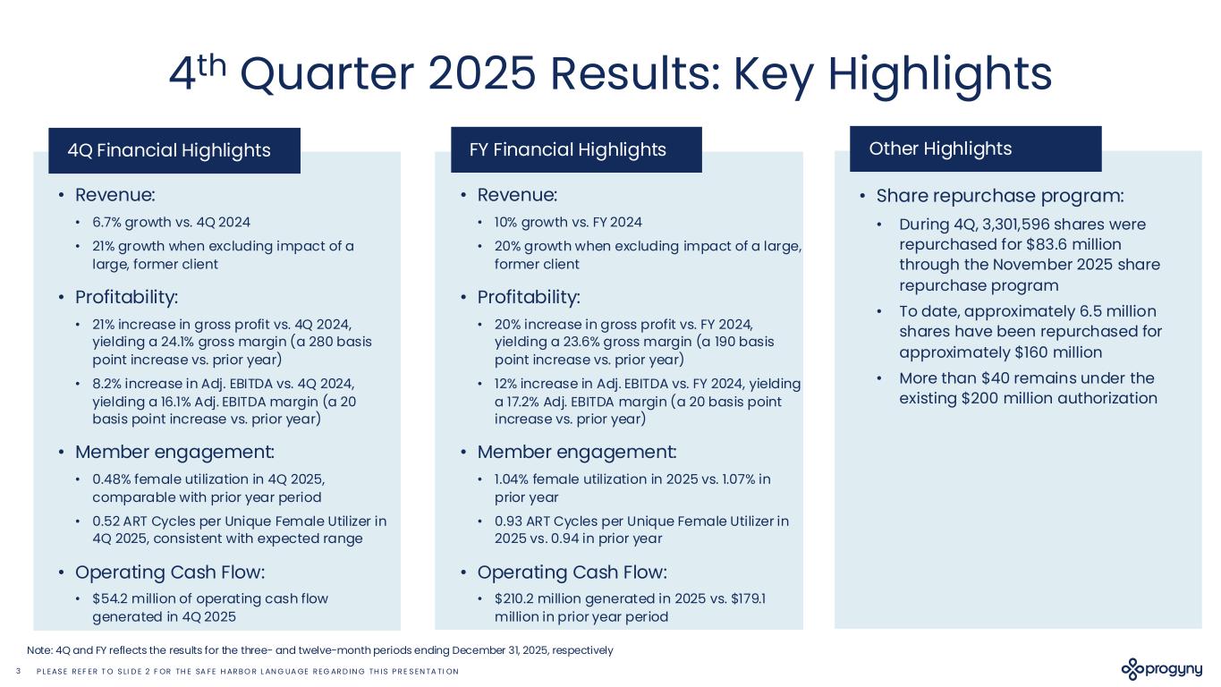 P L EAS E R EF ER T O S LI D E 2 F OR TH E SA FE H AR B O R L AN G UA GE R EG AR D IN G TH IS P R E S EN TA TI ON2 Safe Harbor Statement This presentation contains forward-looking statements within the meaning of the Private Securities Litigation Reform Act of 1995. We intend such forward-looking statements to be covered by the safe harbor provisions for forward-looking statements contained in Section 27A of the Securities Act of 1933, as amended, and Section 21E of the Securities Exchange Act of 1934, as amended. All statements contained in this press release other than statements of historical fact, including, without limitation, statements regarding our financial outlook for the first quarter and full year 2026, including the impact of our sales season and client launches; our anticipated number of clients and covered lives for 2026; our expected utilization rates and mix; the demand for our solutions; our positioning to successfully manage economic uncertainty on our business; the timing of client decisions; our ability to retain existing clients and acquire new clients; and our business strategy, plans, goals and expectations concerning our market position, future operations, and other financial and operating information. The words “anticipates,” “assumes,” “believe,” “contemplate,” “continues, ” “could,” “estimates,” “expects,” “future,” “intends,” “may,” “plans,” “predict,” “potential,” “project,” “seeks,” “should,” “target,” “will,” and the negative of these or similar expressions and phrases are intended to identify forward-looking statements, though not all forward-looking statements use these words or expressions. Forward-looking statements are neither promises nor guarantees, but involve known and unknown risks, uncertainties and other important factors that may cause our actual results, performance or achievements to be materially different from any future results, performance or achievements expressed or implied by the forward-looking statements. These risks include, without limitation, failure to meet our publicly announced guidance or other expectations about our business; competition in the market in which we operate; our history of operating losses and ability to sustain profitability; unfavorable conditions in our industry or the United States economy; our limited operating history and the difficulty in predicting our future results of operations; our ability to attract and retain clients and increase the adoption of services within our client base; the loss of any of our largest client accounts; changes in the technology industry; changes or developments in the health insurance market; negative publicity in the health benefits industry; lags, failures or security breaches in our computer systems or those of our vendors; a significant change in the utilization of our solutions; our ability to offer high-quality support; positive references from our existing clients; our ability to develop and expand our marketing and sales capabilities; the rate of growth of our future revenue; the accuracy of the estimates and assumptions we use to determine the size of target markets; our ability to successfully manage our growth; reductions in employee benefits spending; seasonal fluctuations in our sales; the adoption of new solutions and services by our clients or members; our ability to innovate and develop new offerings; our ability to adapt and respond to the changing medical landscape, regulations, and client needs, requirements or preferences; our ability to maintain and enhance our brand; our ability to attract and retain members of our management team, key employees, or other qualified personnel; risks related to any litigation against us; our ability to maintain our Center of Excellence network of healthcare providers; our strategic relationships with and monitoring of third parties; our ability to maintain our pharmacy distribution network if there is a disruption to our network or its associated supply chains; our relationship with key pharmacy program partners or any decline in rebates provided by them; our ability to maintain our relationships with benefits consultants; exposure to credit risk from our members; risks related to government regulation; risks related to our business with government entities; our ability to protect our intellectual property rights; risks related to acquisitions, strategic investments, or partnerships; federal tax reform and changes to our effective tax rate; the imposition of state and local state taxes; our ability to utilize a portion of our net operating loss or research tax credit carryforwards; our ability to develop or maintain effective internal control over financial reporting; and our ability to adapt and respond to the changing SEC or stakeholder expectations regarding environmental, social and governance practices. For a detailed discussion of these and other risk factors, please refer to our filings with the Securities and Exchange Commission (the “SEC”), including in the section entitled “Risk Factors” in our Annual Report on Form 10-K for the fiscal year ended December 31, 2025, and subsequent reports that we file with the SEC, which are available at http://investors.progyny.com and on the SEC’s website at https://www.sec.gov. Forward-looking statements represent our management’s beliefs and assumptions only as of the date of this press release. Our actual future results could differ materially from what we expect. Except as required by law, we assume no obligation to update these forward-looking statements publicly, or to update the reasons. Non-GAAP Financial Measures: In addition to disclosing financial measures prepared in accordance with U.S. generally accepted accounting principles (“GAAP”), this presentation includes the non-GAAP financial measures Adjusted EBITDA, Adjusted EBITDA margin, Adjusted EBITDA margin on incremental re