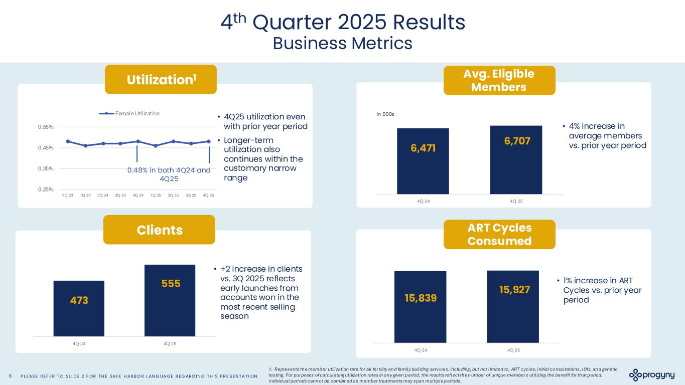 P L EAS E R EF ER T O S LI D E 2 F OR TH E SA FE H AR B O R L AN G UA GE R EG AR D IN G TH IS P R E S EN TA TI ON3 4th Quarter 2025 Results: Key Highlights 4Q Financial Highlights • Revenue: • 6.7% growth vs. 4Q 2024 • 21% growth when excluding impact of a large, former client • Profitability: • 21% increase in gross profit vs. 4Q 2024, yielding a 24.1% gross margin (a 280 basis point increase vs. prior year) • 8.2% increase in Adj. EBITDA vs. 4Q 2024, yielding a 16.1% Adj. EBITDA margin (a 20 basis point increase vs. prior year) • Member engagement: • 0.48% female utilization in 4Q 2025, comparable with prior year period • 0.52 ART Cycles per Unique Female Utilizer in 4Q 2025, consistent with expected range • Operating Cash Flow: • $54.2 million of operating cash flow generated in 4Q 2025 Other Highlights • Share repurchase program: • During 4Q, 3,301,596 shares were repurchased for $83.6 million through the November 2025 share repurchase program • To date, approximately 6.5 million shares have been repurchased for approximately $160 million • More than $40 remains under the existing $200 million authorization FY Financial Highlights • Revenue: • 10% growth vs. FY 2024 • 20% growth when excluding impact of a large, former client • Profitability: • 20% increase in gross profit vs. FY 2024, yielding a 23.6% gross margin (a 190 basis point increase vs. prior year) • 12% increase in Adj. EBITDA vs. FY 2024, yielding a 17.2% Adj. EBITDA margin (a 20 basis point increase vs. prior year) • Member engagement: • 1.04% female utilization in 2025 vs. 1.07% in prior year • 0.93 ART Cycles per Unique Female Utilizer in 2025 vs. 0.94 in prior year • Operating Cash Flow: • $210.2 million generated in 2025 vs. $179.1 million in prior year period Note: 4Q and FY reflects the results for the three- and twelve-month periods ending December 31, 2025, respectively