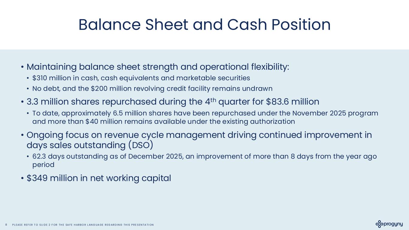 P L EAS E R EF ER T O S LI D E 2 F OR TH E SA FE H AR B O R L AN G UA GE R EG AR D IN G TH IS P R E S EN TA TI ON7 4th Quarter 2025 Results Last Twelve Months Trends LTM Gross Profit LTM Adj. EBITDA LTM OCF • $1.29B in trailing twelve-month revenue, an increase of 10% relative to the year ago period LTM Revenue 4Q 24 1Q 25 2Q 25 3Q 25 4Q 25 $B 4Q 24 1Q 25 2Q 25 3Q 25 4Q 25 • $210M in trailing twelve-month operating cash flow, a 17% increase relative to the year ago period $M • $305M in trailing twelve-month gross profit, an increase of 20% relative to the year ago period 100 200 300 4Q 24 1Q 25 2Q 25 3Q 25 4Q 25 $M • $222M in trailing twelve-month Adj. EBITDA, an increase of 12% relative to the year ago period 100 175 250 4Q 24 1Q 25 2Q 25 3Q 25 4Q 25 $M $1.29B $222M $305M $210M $1.17B $199M $253M $179M Note: all nu mbers pr esented io n this slid e includ e th e co ntribution of th e large client who was under a tran sitio n of care ag reement unti l June 30, 2025