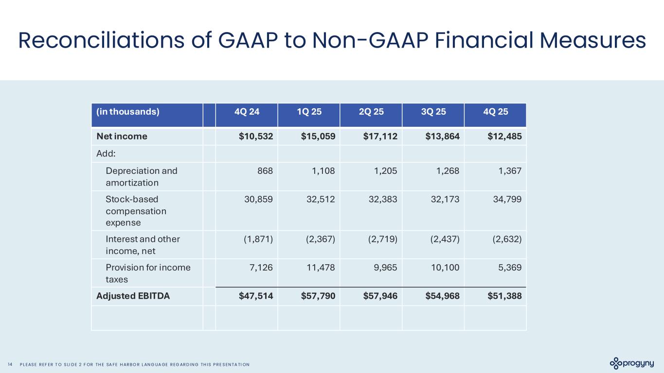 P L EAS E R EF ER T O S LI D E 2 F OR TH E SA FE H AR B O R L AN G UA GE R EG AR D IN G TH IS P R E S EN TA TI ON13 Reconciliations of Non-GAAP Financial Guidance (in thousands) Three Months Ending March 31, 2026 Year Ending December 31, 2026 Low High Low High Net Income $20,800 $23,700 $95,400 $106,100 Add: Stock-based Compensation Expense 21,000 21,000 85,000 85,000 Income tax effect of non-GAAP adjustment (5,300) (5,300) (21,300) (21,300) Adjusted Net income* $36,500 $39,400 $159,100 $169,800 Diluted Shares 87,000,000 87,000,000 87,000,000 87,000,000 Adjusted Earnings per Diluted Share $0.42 $0.45 $1.83 $1.95